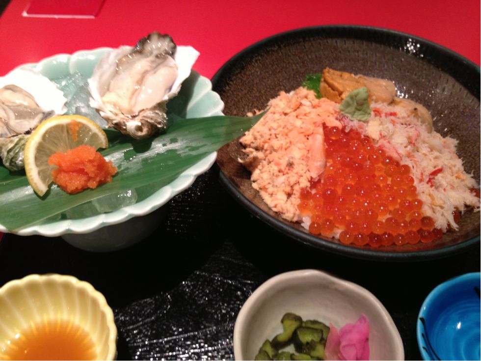 いくら、ウニ、鮭、カニの四色丼に、さらに生牡蠣2個を追加。